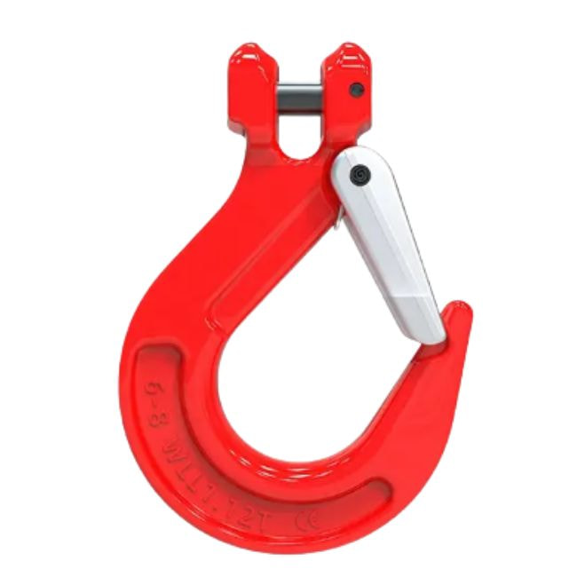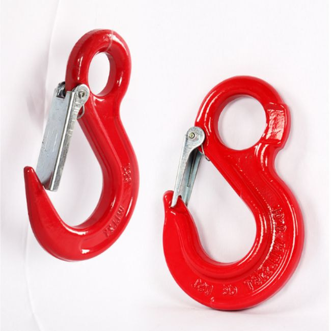 Đây là bộ phận nhỏ nhưng cực kỳ quan trọng. Nó có tác dụng khóa miệng móc lại, ngăn không cho dây cáp trượt ra ngoài trong quá trình vận hành. Nguyên tắc an toàn này cũng khắt khe như việc khóa phanh trên Xe nâng mặt bàn 350kg nâng cao 1.3m khi dừng đỗ.