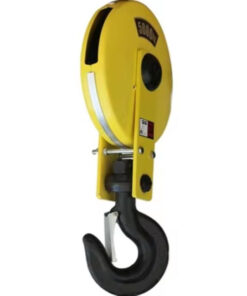 Điểm nhận diện đặc trưng của móc cẩu palang loại tốt là phần thân puly thường được dán tem thông số tải trọng rất rõ ràng (ví dụ: tem “2000kg” nổi bật trên nền sơn vàng), giúp người dùng dễ dàng kiểm soát tải trọng làm việc, tránh nhầm lẫn gây mất an toàn.