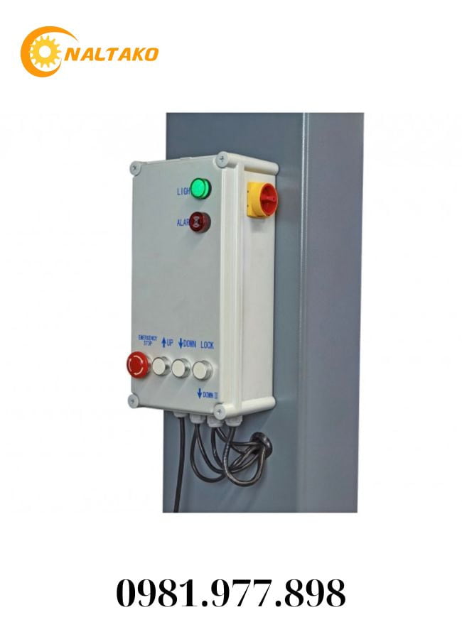 Các nút điều khiển (nâng lên, hạ xuống, dừng khẩn cấp) được lắp trên hộp điều khiển. Thiết bị sử dụng điện để vận hành động cơ bơm thủy lực.