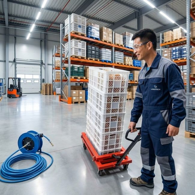 - Kho bãi linh kiện: Di chuyển các khay nhựa đựng chi tiết máy trong nhà xưởng.